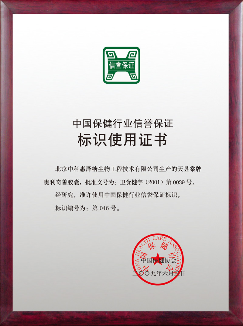 2009年6月,荣获中国保健协会颁发的“中国保健行业信誉保证标识使用证书”。